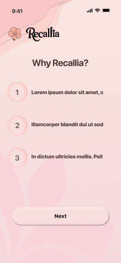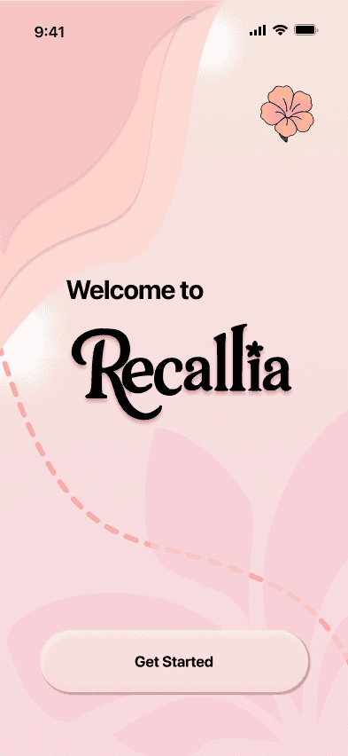 A sleek, Recallia-themed design keeps onboarding approachable andemotionally engaging